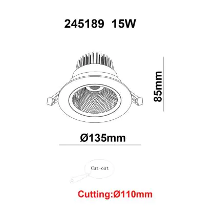 | Herstellername | White label LED Downlight Round Tiltable 15W 1200lm 60D 930 UGR19 CutoutØ110mm FrameØ135mm | |