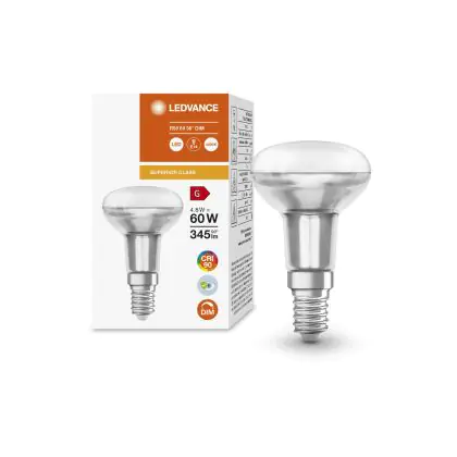 La lampe LED Ledvance Superior R50 LED E14 Spot Dépolie 4.8W 345lm - 940 | Dimmable - Meilleur rendu de couleur avec culot E14 (Ampoule à vis petit culot) est le remplacement idéal des lampes à incandescence et halogènes classiques. En raison de la faible consommation d'énergie, vous économisez considérablement sur vos coûts d'énergie. Les lampes à LED Ledvance n’utilisent qu’une petite partie de la puissance (4.8 W) que les lampes à incandescence et halogènes classiques (60 W). Les lampes à LED ont une excellente classe énergétique G, ce qui signifie qu'elles sont très écologiques et peuvent être recyclées après utilisation. En raison de leur durée de vie considérable de 25000 heures, vous n’aurez pas à les changer de si tôt.