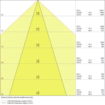 Le code couleur se compose de l'indice de rendu des couleurs (IRC) et de la température de couleur (Kelvin). Le premier chiffre indique le rendu des couleurs (1 = très mauvais rendu des couleurs, 9 = meilleure authenticité des couleurs). Le deuxième et troisième chiffre indiquent la température de la couleur. Exemple : Le code couleur "830" indique que la lampe a un bon rendu des couleurs (8) et une couleur de lumière blanche chaude (30 = 3000K). |